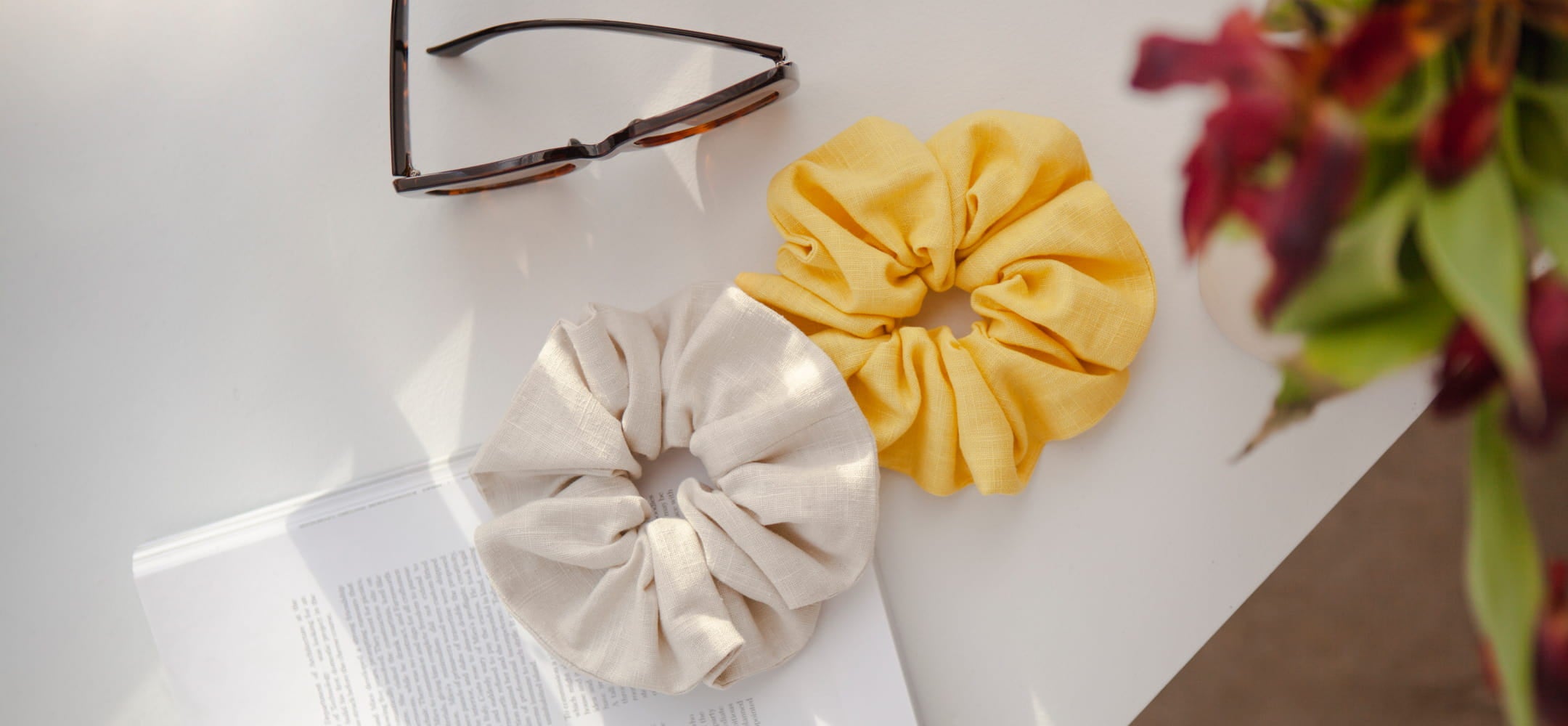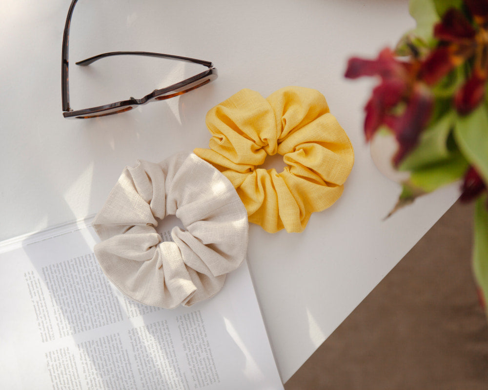 Wir legen ab in Richtung Sommer. Im Gepäck: XXL-Scrunchies aus fein texturiertem Leinen. Bringt Volumen ins Haar und Blicke aufs Handgelenk.